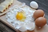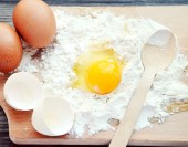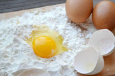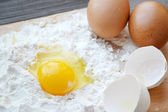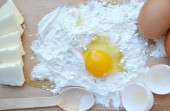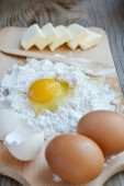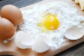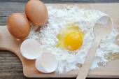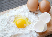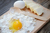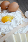 białej mąki z jaj, masła i drewnianą łyżką na boardzie gotowania