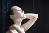Piękna Brunetka kobieta pod prysznicem po długo stresującym dniu. Kobieta, prysznica i cieszyć się kąpiel w nowoczesną łazienkę designerską. Spa i opieka zdrowotna. Koncepcja Pielęgnacja skóry