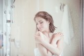 Zdjęcie "Piękna Brunetka kobieta pod prysznicem po długo stresującym dniu. Kobieta, prysznica i cieszyć się kąpiel w nowoczesną łazienkę designerską. Spa i opieka zdrowotna. Koncepcja Pielęgnacja skóry" może być wykorzystywane do celów osobistych i komercyjnych zgodnie z warunkami zakupionej licencji Royalty-free. Obraz jest dostępny do pobrania w jakości wysokiej rozdzielczości do 5760x3840.