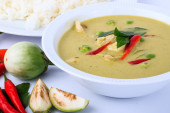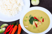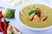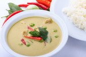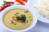 Zdjęcie "Zielonej tajskiej kurczaka curry intensywna zupa na tle brązowego sukna." może być wykorzystywane do celów osobistych i komercyjnych zgodnie z warunkami zakupionej licencji Royalty-free. Obraz jest dostępny do pobrania w jakości wysokiej rozdzielczości do 5760x3840.