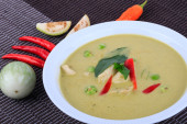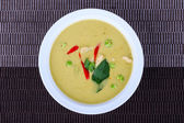 Zielonej tajskiej kurczaka curry intensywna zupa na tle brązowego sukna.
