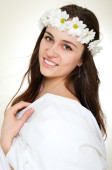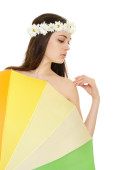 młoda kobieta w rumianku wieniec z kolorowy parasol
