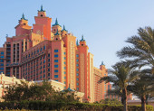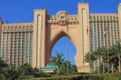 Dubaj promenady śpiewały fontanny na tle architekt