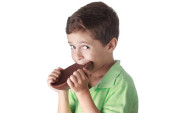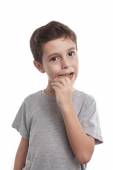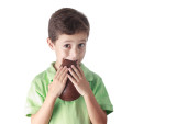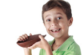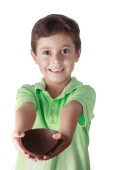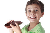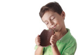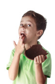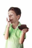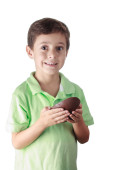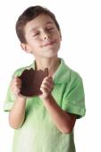 Mały chłopiec czekolada jajko jedzenie na białym tle