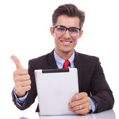 biznes człowiek trzyma tabletkę i Dokonywanie znak ok