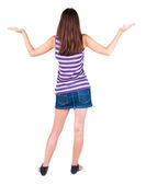 Zdjęcie "Widok młodej kobiety brunetka, wskazując na ścianie z tyłu ." może być wykorzystywane do celów osobistych i komercyjnych zgodnie z warunkami zakupionej licencji Royalty-free. Obraz jest dostępny do pobrania w jakości wysokiej rozdzielczości do 5760x3840.