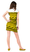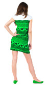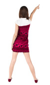 Widok młodej kobiety brunetka, wskazując na ścianie z tyłu .