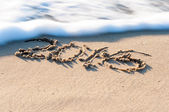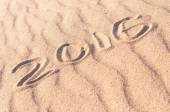 Znak 2016 i słońca na piaszczystej plaży. Lato podróżować pojęcie