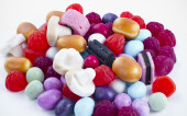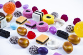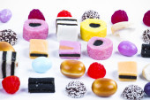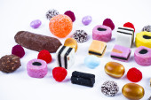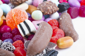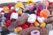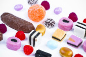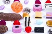 wiele cukierki na przekąski background.fruit biały