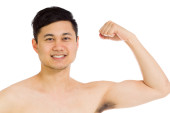 Muskularny mężczyzna Azji wyginanie biceps za pusty znak