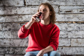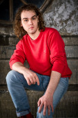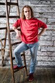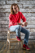Młody człowiek w czerwony sweter i dżinsy siedzi na stołku