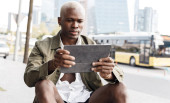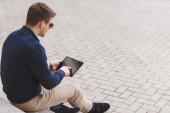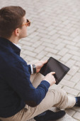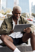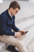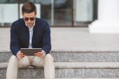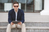 Zdjęcie "Business man with tablet computer sitting on stairs near business center." może być wykorzystywane do celów osobistych i komercyjnych zgodnie z warunkami zakupionej licencji Royalty-free. Obraz jest dostępny do pobrania w jakości wysokiej rozdzielczości do 5760x3840.