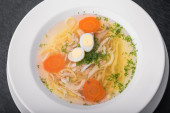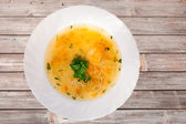 Płyta z zupa z kurczaka z marchewką i makaron na białym talerzu