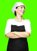 kobieta średniej wieku gotować na patelni sosem na zielonym tle