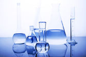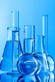 probówki z błękitnym płynem na niebieskim tle