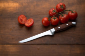 Zdjęcie "Wiśniowe pomidory na deskę do krojenia nożem" może być wykorzystywane do celów osobistych i komercyjnych zgodnie z warunkami zakupionej licencji Royalty-free. Obraz jest dostępny do pobrania w jakości wysokiej rozdzielczości do 5760x3840.