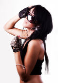 Seksowna brunetka Kobieta w czapce z różowym pikselami pistolet zabawka i Szkło przeciwsłoneczne