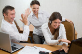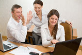 Zdjęcie "Biuro zespołu z laptopami i klaskać gestur" może być wykorzystywane do celów osobistych i komercyjnych zgodnie z warunkami zakupionej licencji Royalty-free. Obraz jest dostępny do pobrania w jakości wysokiej rozdzielczości do 5760x3840.