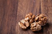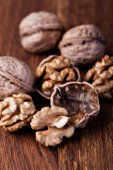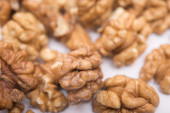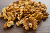 orzechy włoskie na białym tle na drewnianym stołem