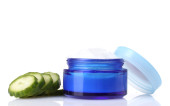 otwarty słoik kremu z świeżych zielonych liści w kropelki wody na białym tle