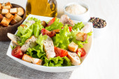 Świeże sałatki z pomidora, ruccola, pierś z kurczaka, rukolą, krakersy i przyprawy. Sałatka Cezar w misce białe, przezroczyste na drewniane tła