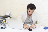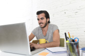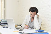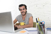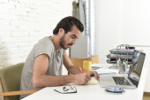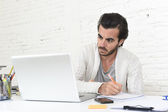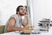 Student przygotowuje projekt uniwersytecki lub Hipster styl Freelancer biznesmen pracy z laptopem