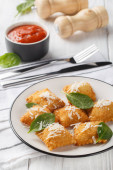 W plastrach pieczonych ziemniaków z serem i sosem z bliska na stole.