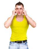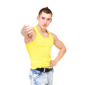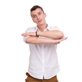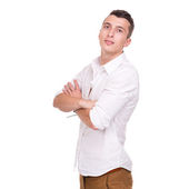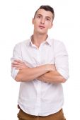 Szczęśliwy człowiek młody kadrowania fotografii na biały