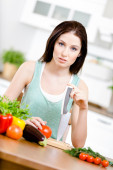 młoda kobieta, gospodyni przygotowuje obiad sałatka jarzynowa w