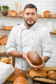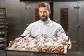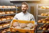 Piekarz gospodarstwa bagietki w produkcji