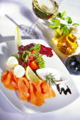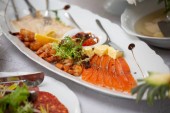 Pokrojone kawałki łososia i cytryny na białym talerzu w restauracji