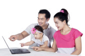 Szczęśliwe dzieci i tata korzystać z laptopa na kanapie