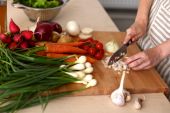 Kucharze ręce przygotowanie sałatka jarzynowa - zbliżenie strzał