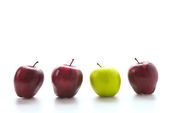 zielone jabłko wśród czerwonych jabłek na białym tle