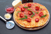 Zdjęcie "Pizza Margherita z nożem na Łupek płytki" może być wykorzystywane do celów osobistych i komercyjnych zgodnie z warunkami zakupionej licencji Royalty-free. Obraz jest dostępny do pobrania w jakości wysokiej rozdzielczości do 5760x3840.
