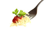 włoskie spagetti gotowane w płytce białe na białym tle