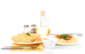 skład pyszne spaghetti z sosem pomidorowym na białe tło zbliżenie