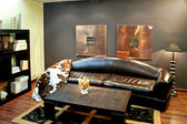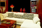 czerwony skórzany sofa zagłówkiem, kapelusz i Wazy