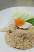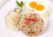 część pary ryżu wymieszać krewetki wklej z wieprzowina słodko i jajkiem.
