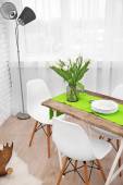 Nowoczesny salon. Meble zestaw stół i krzesła. Bukiet piękne fioletowe tulipany na stole