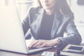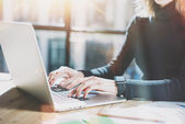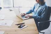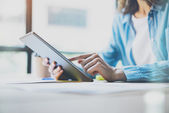 Working process modern office. Finance manager working wood table with new business startup.Using marker for documents. Horizontal. Film and flare effects. Blurred background