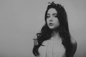 Piękne, tajemnicze, ładny brunetka na ciemnym tle. Czarno-białe zdjęcie piękne tajemnicza brunetka.