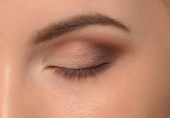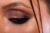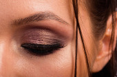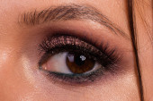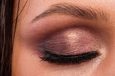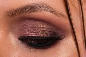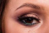 Świetny profesjonalny makijaż oczu. Brokat, cień do oczu, wyróżnienia, eyeliner. Oczy dziewczyny z bliska.