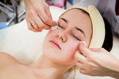 Dziewczyna z kosmetyczką w salonie spa. Kosmetyk wykonuje zabiegi kosmetyczne.Stosując krem kosmetyczny. Kosmetologia, twarz, piękno - koncepcja pielęgnacji skóry twarzy. Artykuł dotyczący kosmetologii.