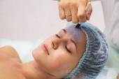 Dziewczyna z kosmetyczką w salonie spa. Kosmetyk wykonuje zabiegi kosmetyczne.Stosując krem kosmetyczny. Kosmetologia, twarz, piękno - koncepcja pielęgnacji skóry twarzy. Artykuł dotyczący kosmetologii.