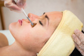 Dziewczyna z kosmetyczką w salonie spa. Kosmetyk wykonuje zabiegi kosmetyczne.Stosując krem kosmetyczny. Kosmetologia, twarz, piękno - koncepcja pielęgnacji skóry twarzy. Artykuł dotyczący kosmetologii.