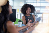Pewnie kobieta projektant pracujący na cyfrowe tabletki w czerwony kreatywnych biurowej