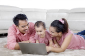 Piękne azjatyckie rodziny korzystać z laptopa w przyrodzie