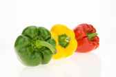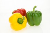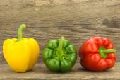 Żółta, zielona i czerwona papryka na drewnianej powierzchni, na białym tle z przestrzenią do kopiowania