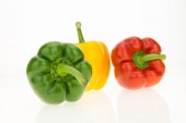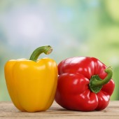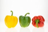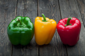 Świeża żółta, Zielona i czerwona papryka, na powierzchni drewnianej.